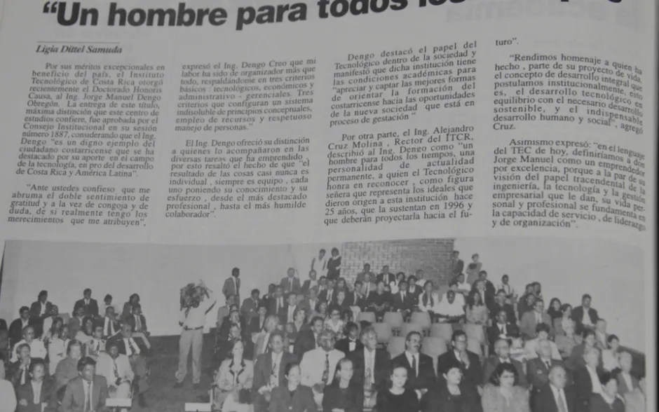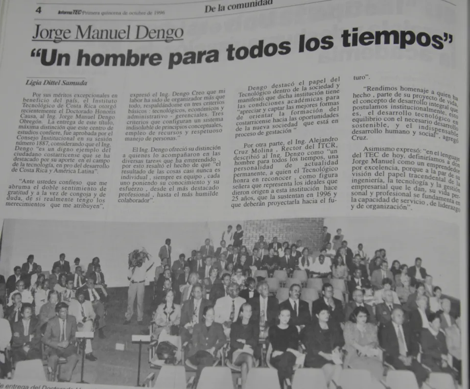 Un desfile de personalidades se dio por la Institución durante el mismo año del aniversario 25 y en los siguientes. Ejemplo de eso, fue cuando en 1996 se otorgó el doctorado honoris causa al ingeniero Jorge Dengo. La razón por la que el Consejo Institucional (CI) aprobó darle a Dengo la máxima distinción que existe en el TEC, se debe a que él “es un digno ejemplo del ciudadano costarricense, que se ha destacado por su aporte en el campo de la tecnología…”, esto según cita el documento oficial del CI en su sesión 1.887.