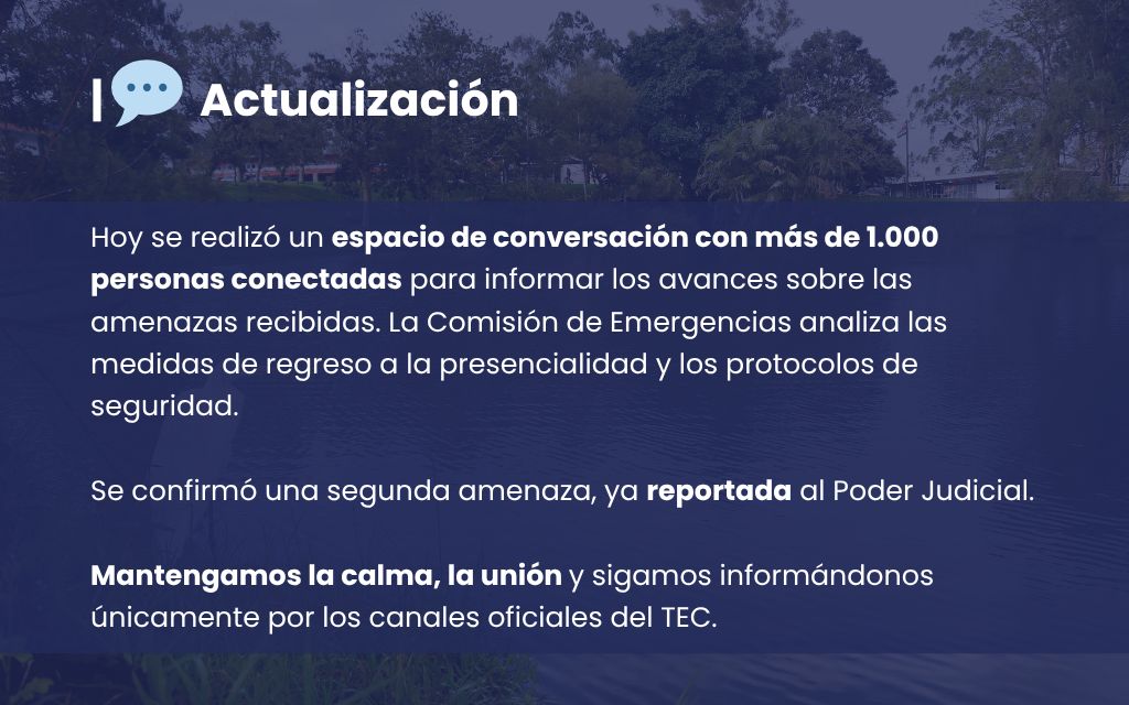 • Hoy se realizó un Espacio de Conversación Institucional en el que la la Comisión Institucional de Emergencias y la administración informamos sobre los avances y actualizaciones respecto a la amenaza recibida por el TEC, vía correo electrónico, el pasado viernes 14 de noviembre de 2025.