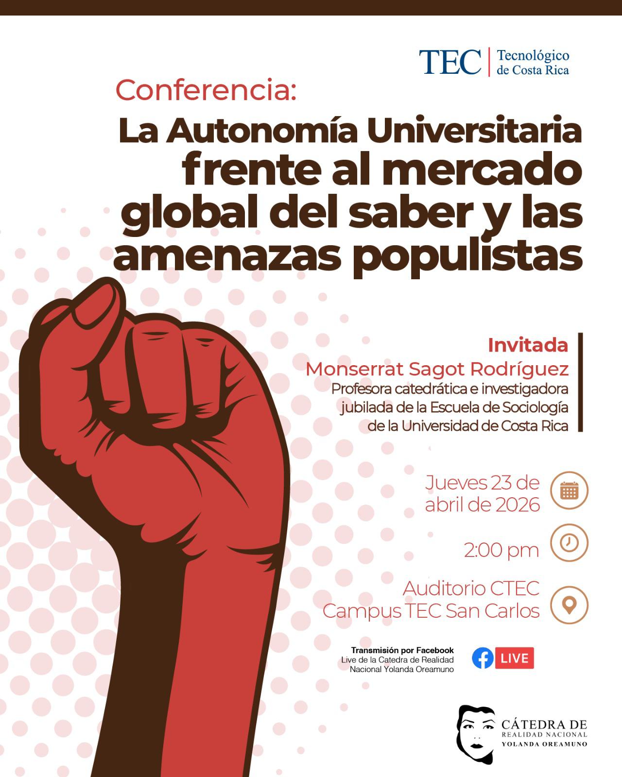Con este fin, la Cátedra de Realidad Nacional Yolanda Oreamuno, en conjunto con la Comisión de Autonomía Universitaria del TEC, invitan a la comunidad institucional a la conferencia “La Autonomía Universitaria frente al mercado global del saber y las amenazas populistas”, a cargo de la Dra. Monserrat Sagot Rodríguez, profesora catedrática e investigadora jubilada de la Escuela de Sociología de la Universidad de Costa Rica.