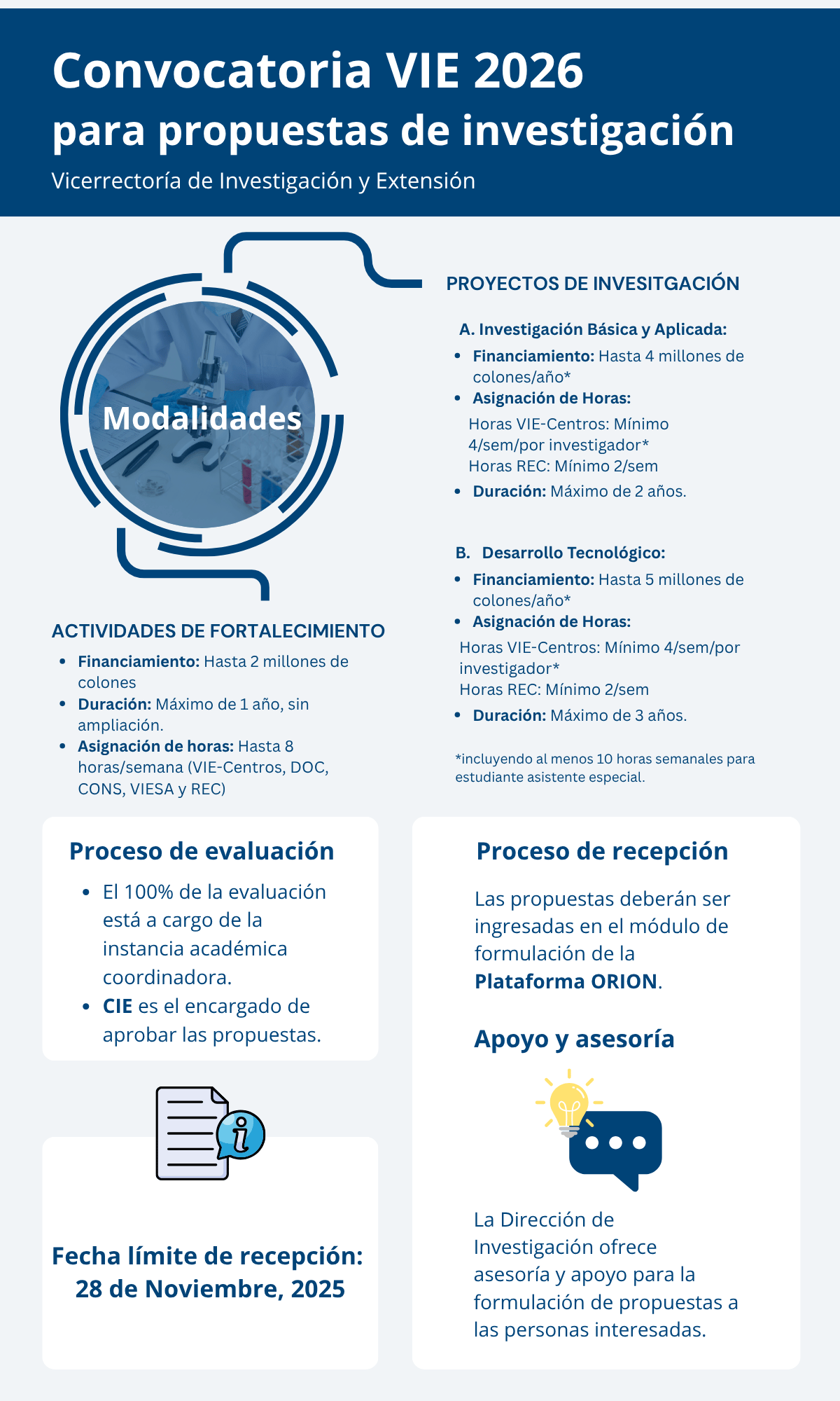 - Disposiciones para la presentación de propuestas nuevas de investigación para ser financiadas con fondos de la VIE para Centros de investigación y Extensión, así como para personas en la Categoría de Investigador Consolidados.