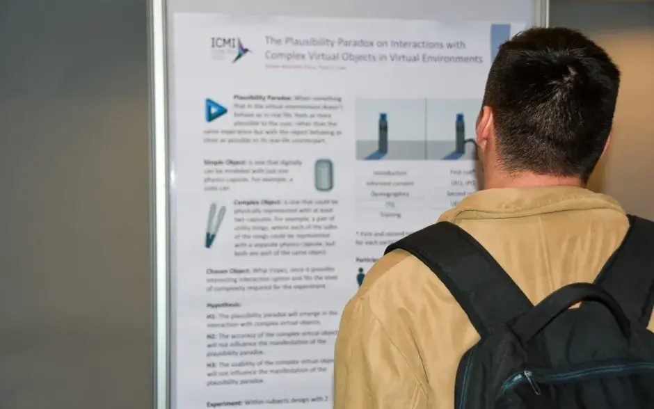 La exposición de pósteres fue el espacio donde los académicos compartieron sus investigaciones. Una de ellas fue la de Yuen y Alvarado, con el tema “The Plausibility Paradox on Interactions with Complex Virtual Objects in Virtual Environments”, la cual, destaca la particularidad en la que algunas veces, las experiencias virtuales tienen diferencias en sus físicas que hacen que la percepción de la interacción tenga variables en el contexto real vrs. el virtual".