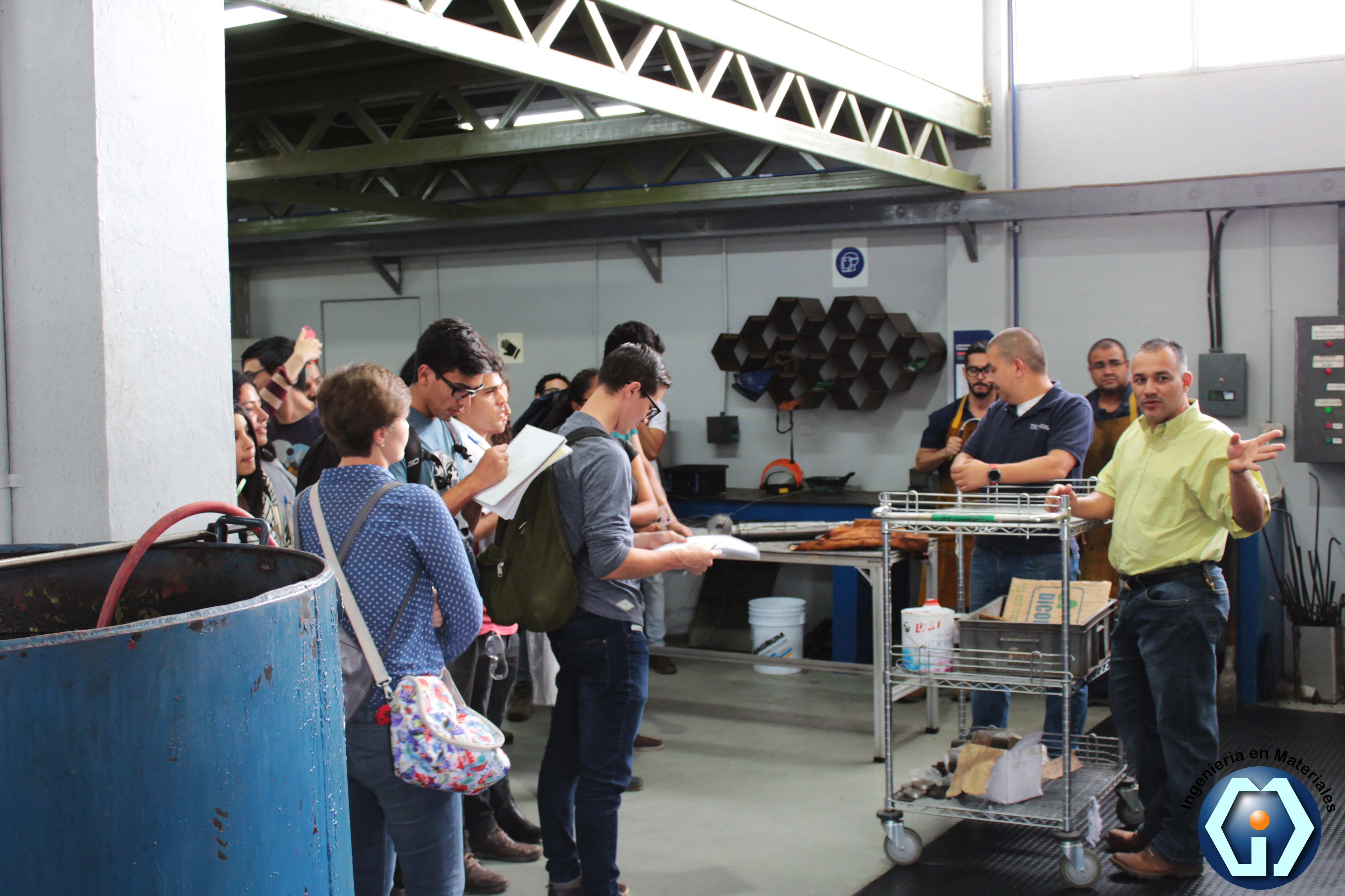 Estudiantes avanzados de la carrera de Ingeniería Química de la Universidad de Costa Rica visitaron las instalaciones de la Escuela de Ciencia e Ingeniería de los Materiales donde tuvieron la posibilidad de interactuar con los profesores de nuestra Escuela quienes tienen a cargo diferentes laboratorios y poder tener un acercamiento a temas que tienen que ver con su especialidad. Aspectos como tratamientos térmicos, fundición de aleaciones metálicas, ensayos mecánicos destructivos y no destructivos y análisis de fallas en materiales fueron abarcados durante la visita. En esta actividad los alumnos quedaron fascinados cuando pudieron ver lo importante que es la Ciencia e Ingeniería de los Materiales en sus futuras profesiones y como un tema que ellos están estudiando en el curso de Ingenieria de Materiales correspondiente al séptimo ciclo del pan de estudios de la carrera de Ingeniería Química tiene aplicación real en una carrera como la nuestra y de cómo se relaciona con la Ingeniería Química.