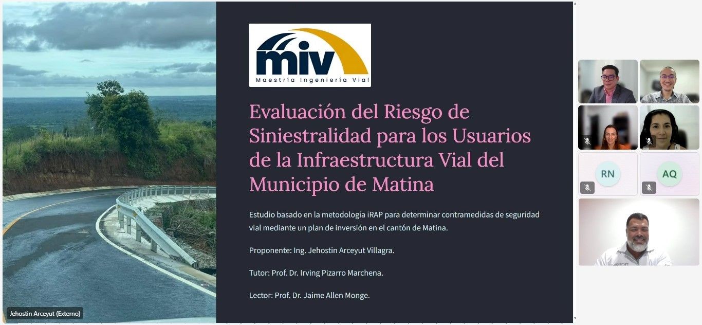 Con mucho orgullo, felicitamos al estudiante Jehostin Arceyut Villagra por la exitosa defensa de su proyecto final de graduación titulado “Evaluación del riesgo de siniestralidad para los usuarios de la infraestructura vial del municipio de Matina”, con el cual culmina sus estudios en la Maestría en Ingeniería Vial del Tecnológico de Costa Rica. Este trabajo, pionero en el país y de los pocos en su tipo, aplicó la metodología iRAP en parte de la red vial cantonal, generando valiosos insumos para la mejora de la seguridad vial y aportando un precedente innovador para la gestión de riesgos en el ámbito municipal.