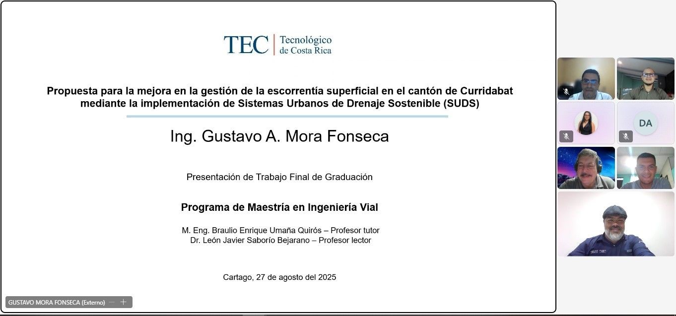 Con gran satisfacción, felicitamos al estudiante Gustavo Mora Fonseca por la exitosa defensa de su proyecto final de graduación titulado “Propuesta para la mejora en el manejo de la escorrentía superficial en el cantón de Curridabat mediante la implementación de Sistemas Urbanos de Drenaje Sostenible (SUDS)”, con el cual concluye de manera sobresaliente sus estudios en la Maestría en Ingeniería Vial del Tecnológico de Costa Rica. Este trabajo constituye un aporte pionero en el país al introducir un enfoque innovador y sostenible en la gestión de la infraestructura urbana.