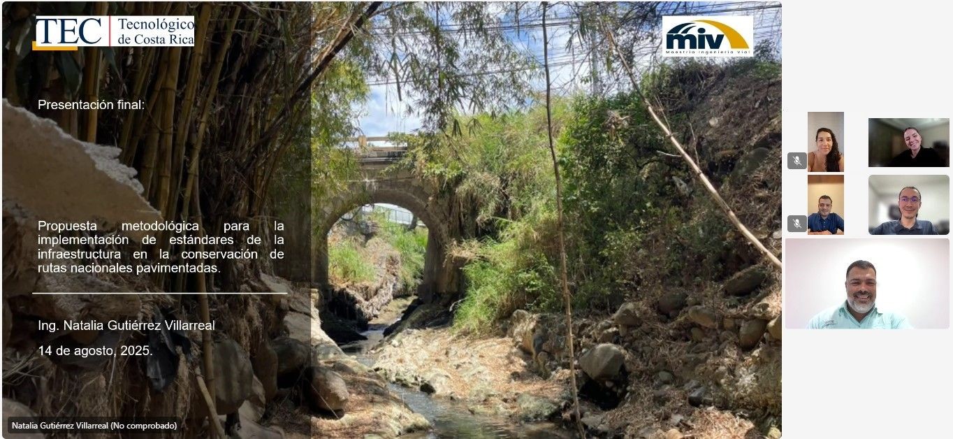 La estudiante Gutiérrez defendió su proyecto final de graduación titulado "Propuesta Metodológica para la Implementación de Estándares de la Infraestructura en la Conservación de Rutas Nacionales Pavimentadas". En el acto de defensa participaron: El Prof. Luis Gustavo Rojas en calidad de tutor, el Prof. Jaime Allen Monge como lector, la Prof. Tania Ávila Esquivel como observadora y como Coordinador del Programa el Prof. Dr. Irving Pizarro