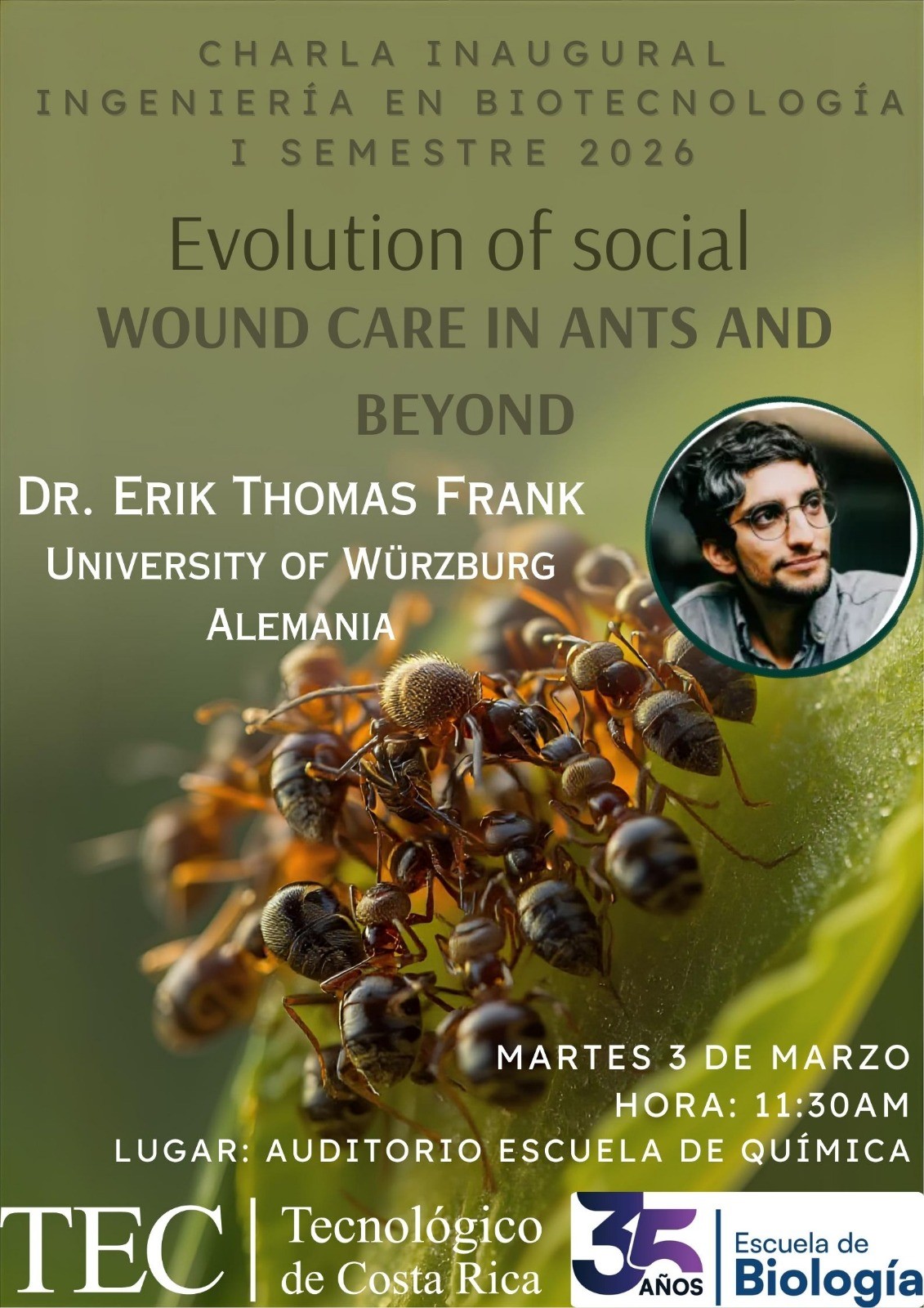 La carrera de Ingeniería en Biotecnología del Tecnológico de Costa Rica (TEC) dará inicio al I semestre 2026 con una charla inaugural de alto nivel académico titulada “Evolution of Social Wound Care in Ants and Beyond”, un espacio dedicado a explorar los avances científicos sobre el comportamiento social y los mecanismos de cuidado en insectos.
