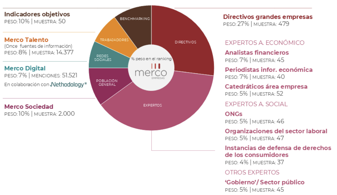 Junto a estas evaluaciones se realizó un análisis en el ámbito digital de las empresas (Merco Digital) en colaboración con Nethodology, y un benchmarking de indicadores objetivos que recoge la realidad de las compañías por medio de una evaluación de méritos reputacionales por parte de 50 empresas.