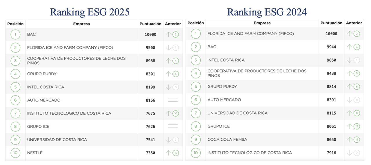 Respecto al ranking de Merco Responsabilidad ESG, en esta ocasión, BAC (1.º), Florida Ice and Farm Company (FIFCO) (2.º) y Cooperativa de Productores de Leche Dos Pinos (3.º) son las tres empresas que lideran el ranking de responsabilidad, mientras que Grupo Purdy (4.º), Intel Costa Rica (5.º), Auto Mercado (6.º), Instituto Tecnológico de Costa Rica (7.º), Grupo ICE (8.º), Universidad de Costa Rica (9.º) y Nestlé (10.º), completan los diez primeros puestos del ranking general ESG.