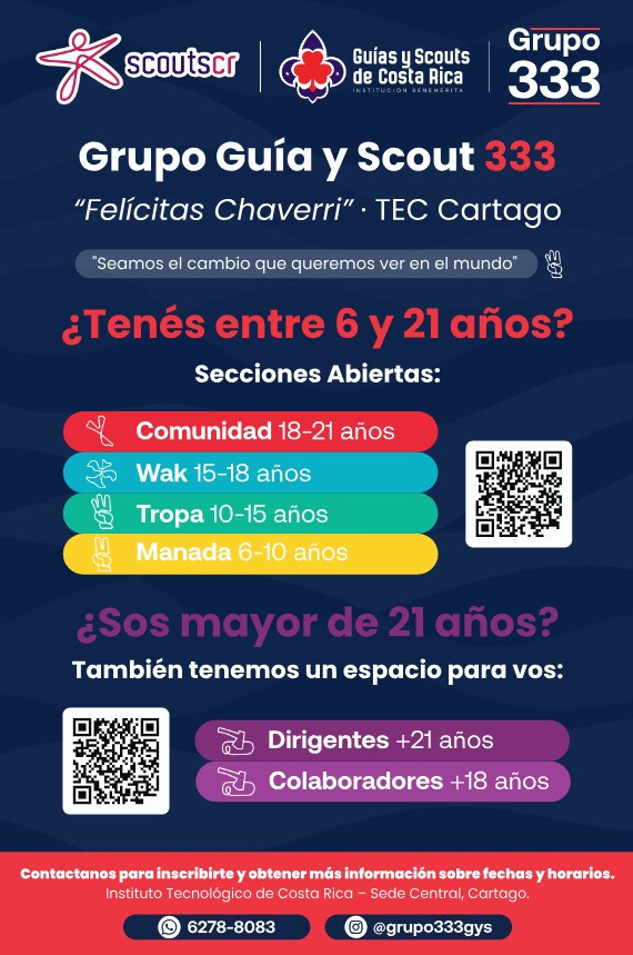 Como parte de esta alianza, se conformó el Grupo 333 de Guías y Scouts del TEC, con sede en el Campus Tecnológico Central Cartago, donde desde el 4 de octubre se realizan reuniones todos los sábados, abiertas a chicos y chicas de 6 a 21 años.
