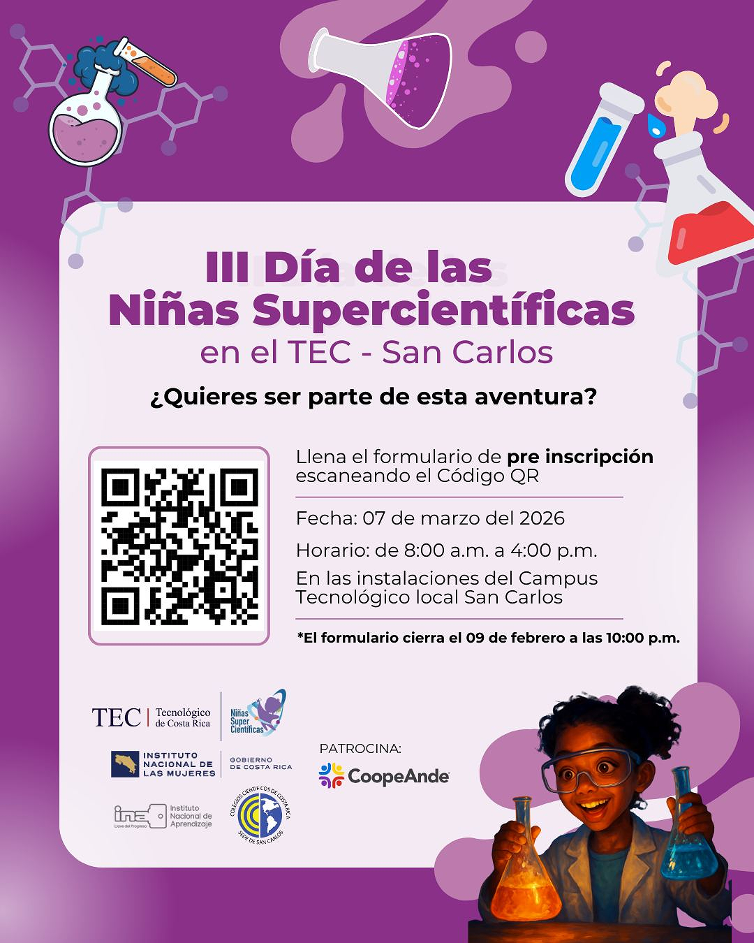 El III Día de las Niñas Supercientíficas se realizará en el Campus Tecnológico Local del TEC en San Carlos. Es un evento exclusivo para niñas de educación primaria de la Región Huetar Norte, correspondiente al área de influencia del TEC de San Carlos.