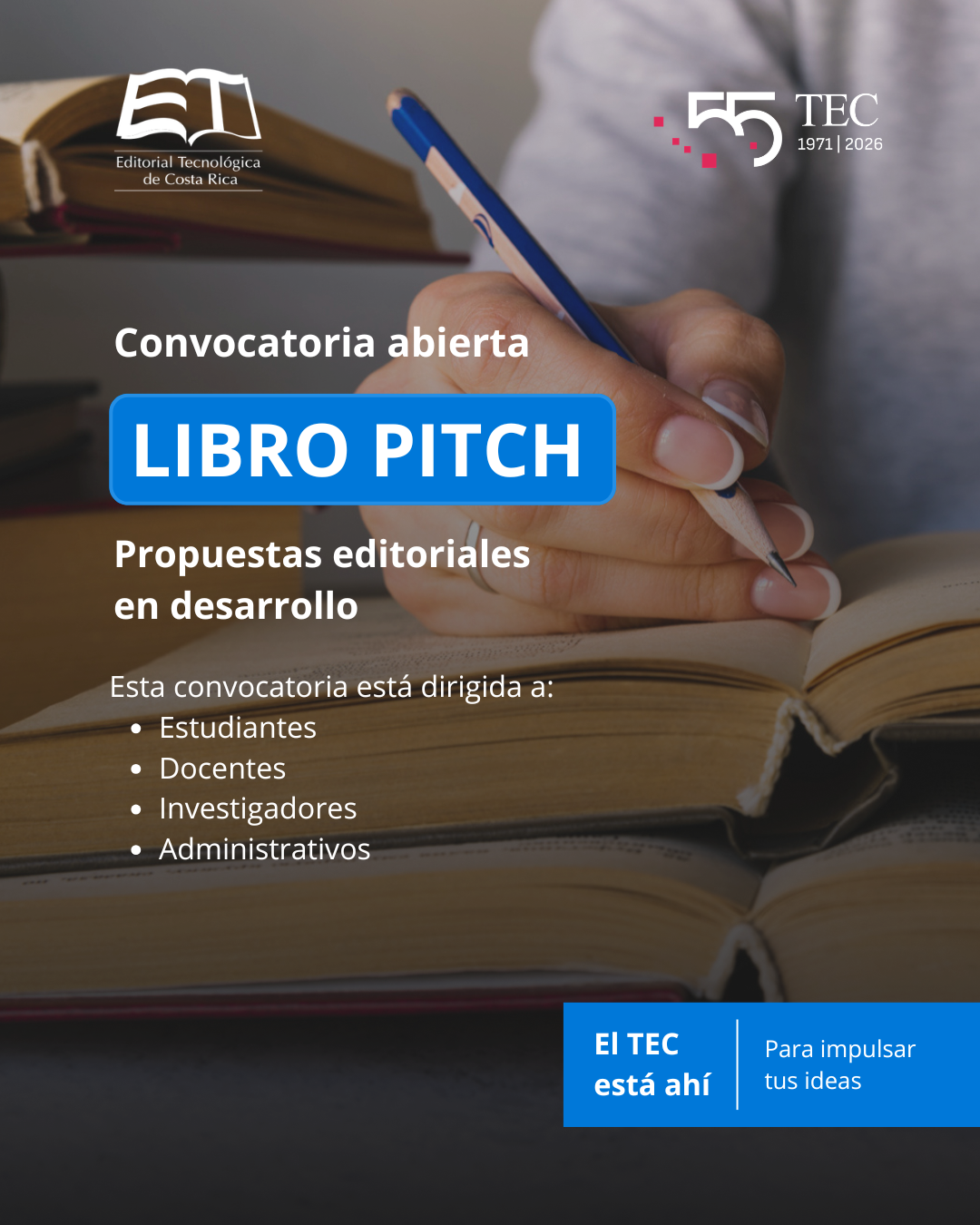 En el marco del Día Internacional del Libro, la Editorial Tecnológica de Costa Rica invita a estudiantes, docentes, personas investigadoras y personal administrativo de todos los Campus Tecnológicos y Centros Académicos a participar en Libro Pitch TEC, un espacio para presentar propuestas de libros académicos, técnicos, científicos o de divulgación.