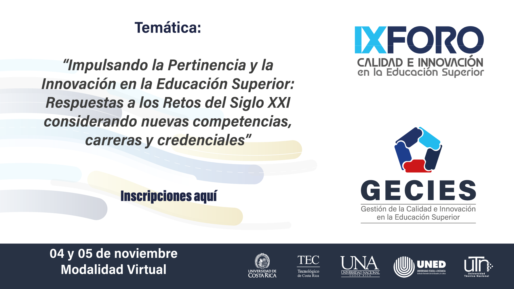 El equipo interuniversitario de Gestión de la Calidad e Innovación en la Educación Superior (GECIES-CR), con representación de la Universidad de Costa Rica (UCR), el Tecnológico de Costa Rica (TEC), la Universidad Nacional (UNA), la Universidad Estatal a Distancia (UNED) y la Universidad Técnica Nacional (UTN), invita a toda la comunidad académica y al público interesado a participar en el IX Foro sobre Gestión de la Calidad e Innovación en la Educación Superior.