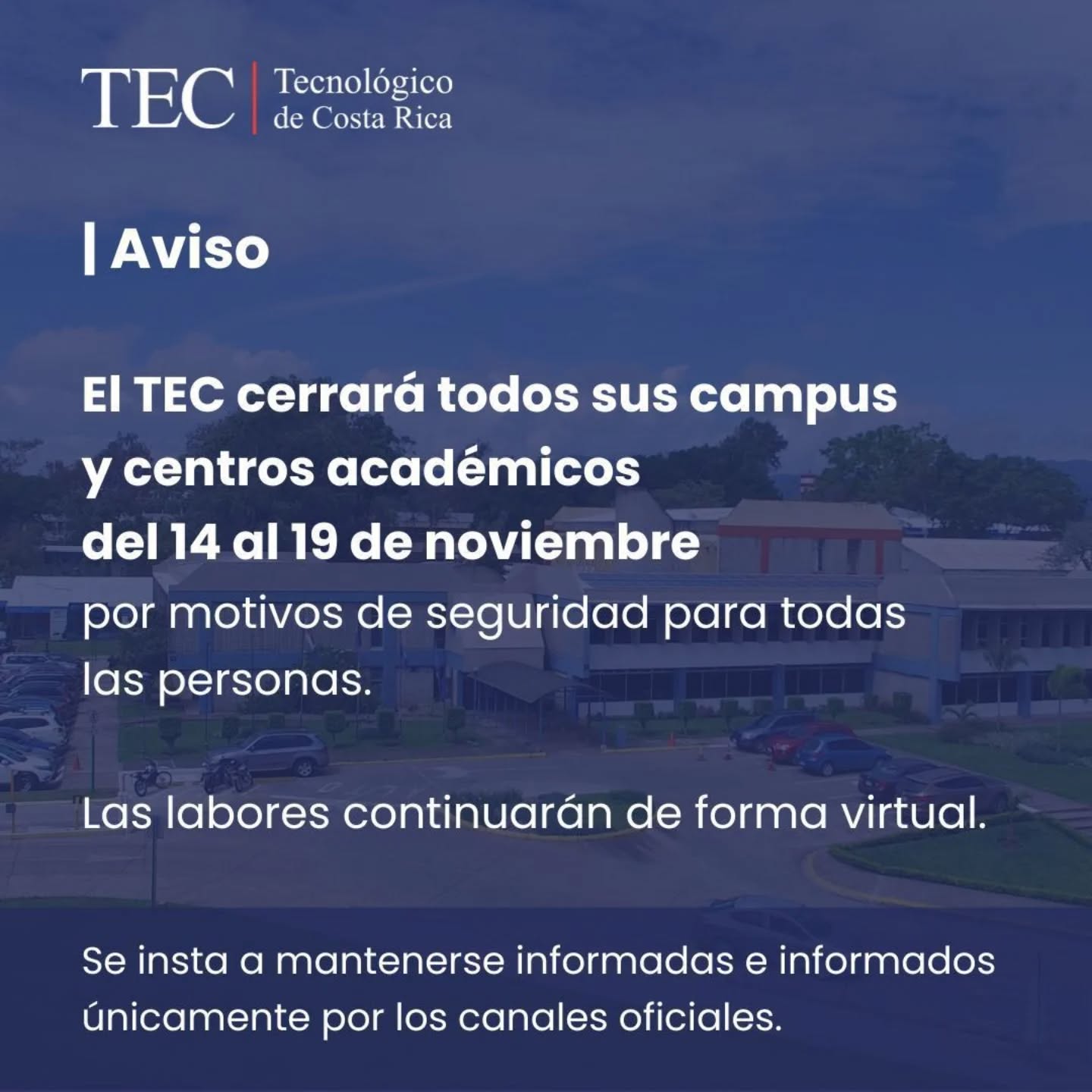 Se suspenden de manera inmediata y hasta el miércoles 19 de noviembre, inclusive, todas las actividades presenciales en todos los Campus Tecnológicos y Centros Académicos del TEC.