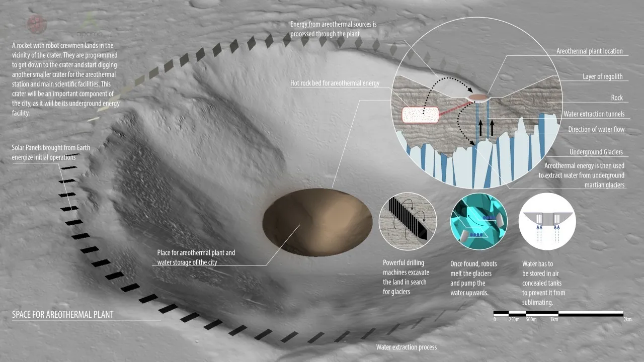Asimismo, incluye elementos explicativos de cómo se podría construir la ciudad en módulos o celdas, y se incluyen materiales presentes en Marte, incluso el hielo marciano.