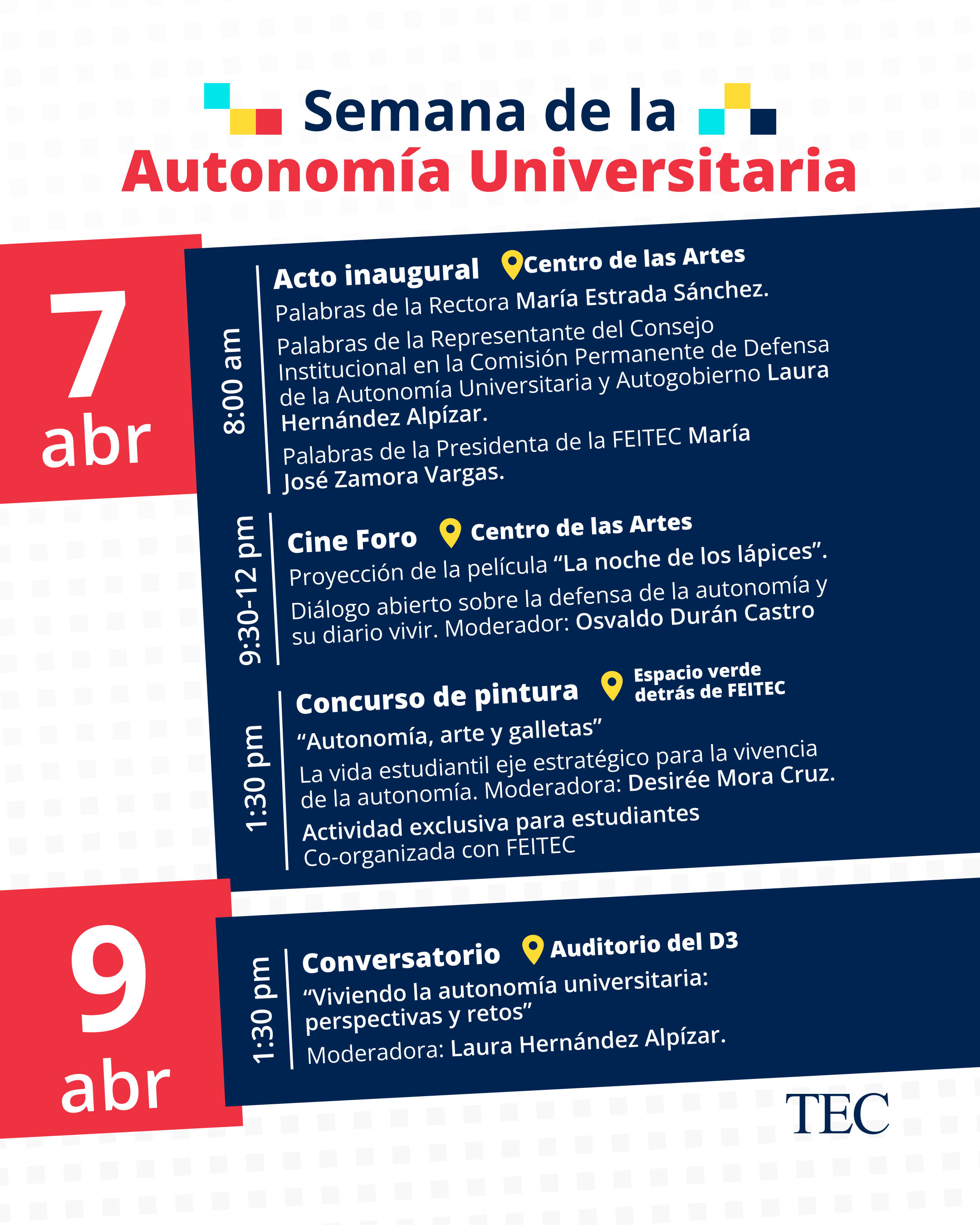 Un cineforo, un concurso de pintura y un conversatorio forman parte de las actividades programadas durante la Semana de la Autonomía Universitaria, que se realizará del 6 al 10 de abril de 2026 en el Campus Tecnológico Central de Cartago.