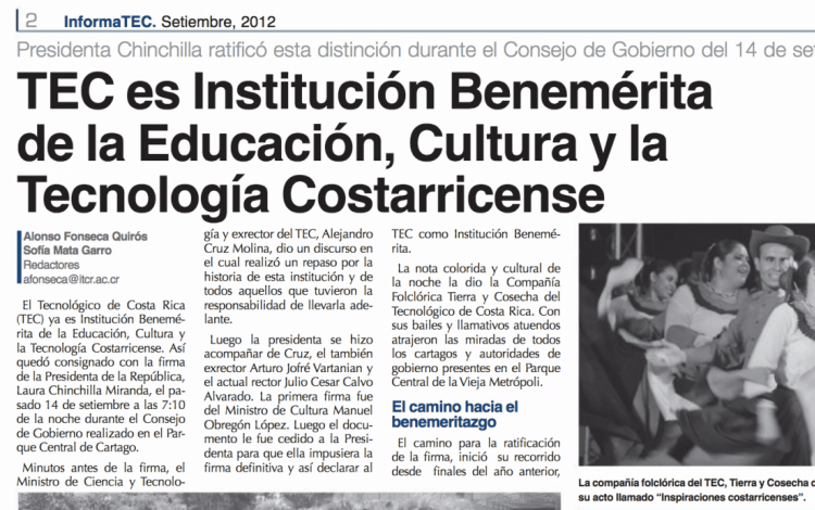 Hace cinco años la presidenta de la República, Laura Chinchilla, ratificó la ley que declaraba al Tecnológico de Costa Rica (TEC): Institución Benemérita de la Educación, Cultura y la Tecnología Costarricense.