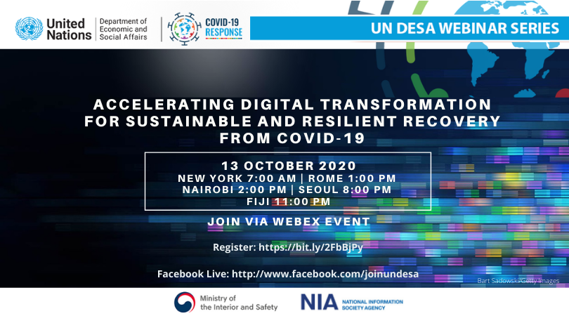 La Dirección de Cooperación tiene el gusto de informar sobre el Webinar: Accelerating Digital Transformation for Sustainable and Resilient Recovery from COVID-19. Este evento es organizado por DESA/DPIDG, Programme Management and Capacity Development Unit, and DESA/DPIDG's Project Office on Governance (UNPOG) de Naciones Unidas.