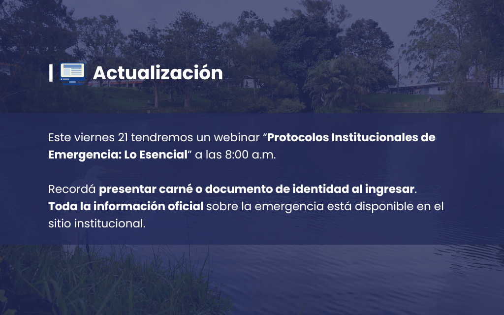 • Mañana viernes 21 de noviembre, a las 8 a.m., realizaremos el webinar: “Protocolos Institucionales de Emergencia: Lo Esencial”. En el que repasaremos los protocolos de Regreso a la Presencialidad y de Atención de un Evento por Persona Armada. Podrá ingresar mediante su correo institucional: @tec.ac.cr, @itcr.ac.cr  o @estudiantec.cr. No es necesario un registro previo.