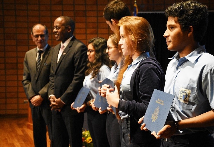 Además de las autoridades de la Institución, estuvo presente Fitzgerald Haney, embajador de Estados Unidos en Costa Rica, quien tuvo la tarea de anunciar los nombres de cinco estudiantes que ganaron una beca para estudiar en ese país durante un año completo.