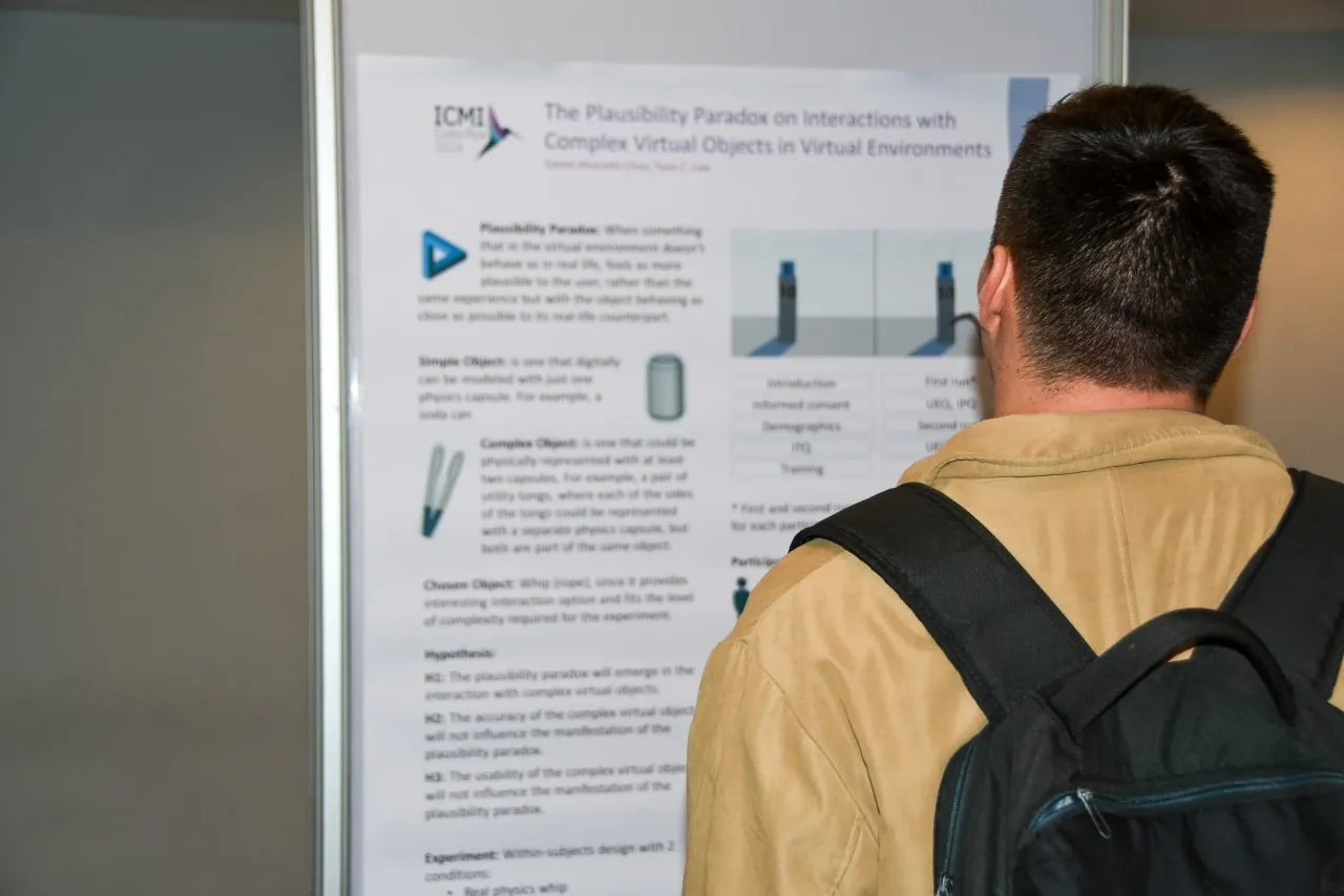 La exposición de pósteres fue el espacio donde los académicos compartieron sus investigaciones. Una de ellas fue la de Yuen y Alvarado, con el tema “The Plausibility Paradox on Interactions with Complex Virtual Objects in Virtual Environments”, la cual, destaca la particularidad en la que algunas veces, las experiencias virtuales tienen diferencias en sus físicas que hacen que la percepción de la interacción tenga variables en el contexto real vrs. el virtual".