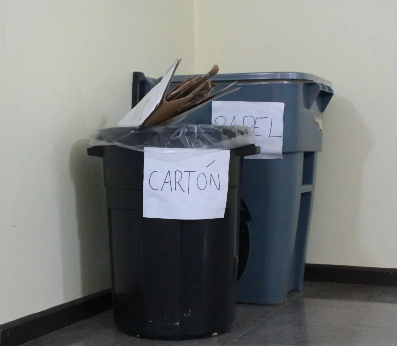 Cajas de papel rotuladas con marcador para clasificar residuos en una habitación es una de las tantas acciones realizadas por los estudiantes que viven en las Residencias de la Institución, con el fin de fomentar una cultura a favor del ambiente.