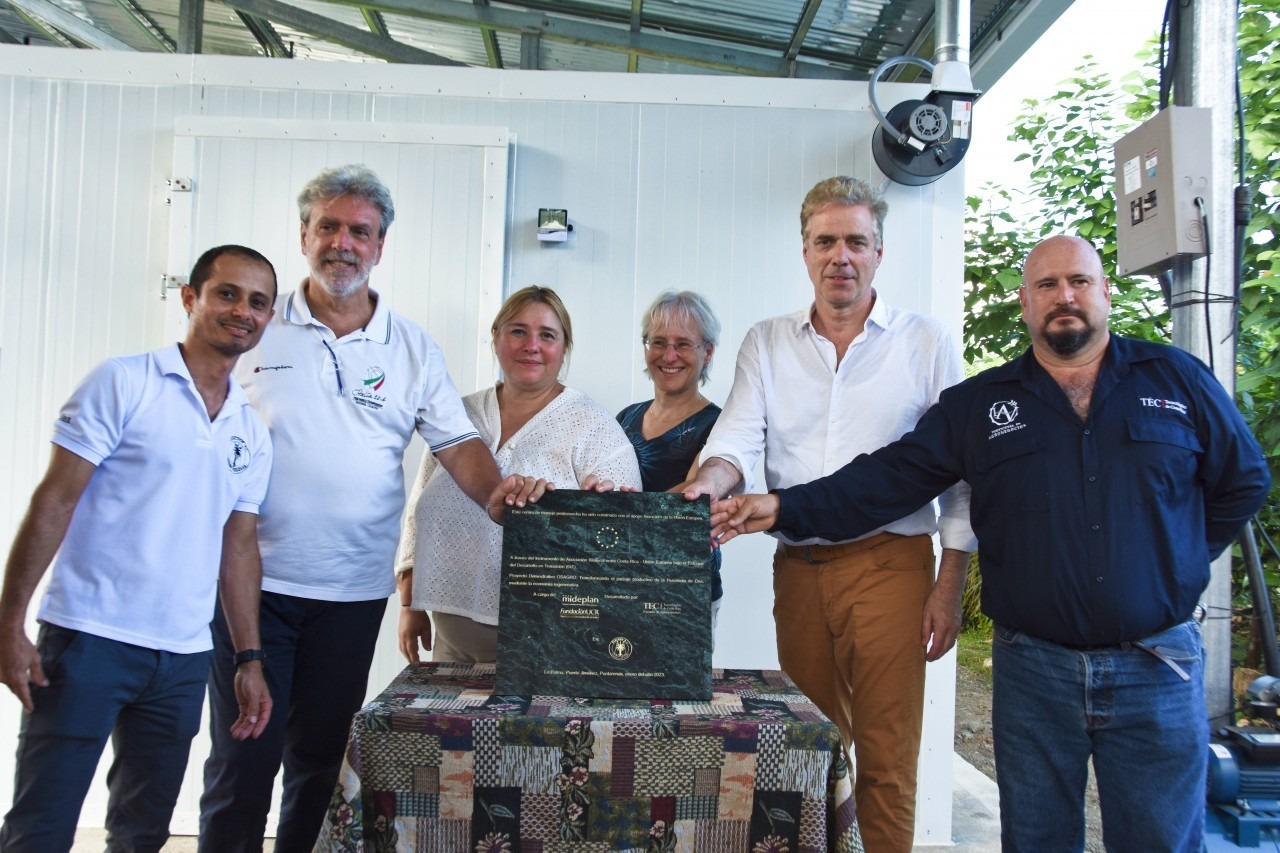 Inauguración del moderno secador solar de cacao y centro de acopio. De izquierda a derecha: Alexander Solórzano, gerente de Osacoop; Alberto Colella, embajador de Italia; María Antonia Calvo, embajadora de la Unión Europea en Costa Rica; Marie Christine