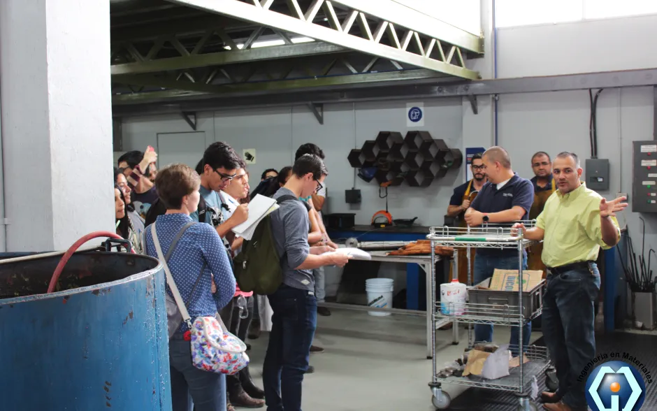 Estudiantes avanzados de la carrera de Ingeniería Química de la Universidad de Costa Rica visitaron las instalaciones de la Escuela de Ciencia e Ingeniería de los Materiales donde tuvieron la posibilidad de interactuar con los profesores de nuestra Escuela quienes tienen a cargo diferentes laboratorios y poder tener un acercamiento a temas que tienen que ver con su especialidad. Aspectos como tratamientos térmicos, fundición de aleaciones metálicas, ensayos mecánicos destructivos y no destructivos y análisis de fallas en materiales fueron abarcados durante la visita. En esta actividad los alumnos quedaron fascinados cuando pudieron ver lo importante que es la Ciencia e Ingeniería de los Materiales en sus futuras profesiones y como un tema que ellos están estudiando en el curso de Ingenieria de Materiales correspondiente al séptimo ciclo del pan de estudios de la carrera de Ingeniería Química tiene aplicación real en una carrera como la nuestra y de cómo se relaciona con la Ingeniería Química.