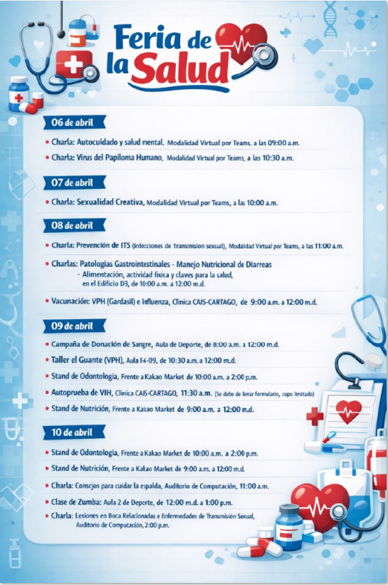 Con el propósito de fortalecer el bienestar y la salud de estudiantes y funcionarios, la Clínica de Atención Integral en Salud del Tecnológico de Costa Rica (TEC), invita a participar de la Feria de la Salud que se llevará a cabo del 06 al 10 de abril.
