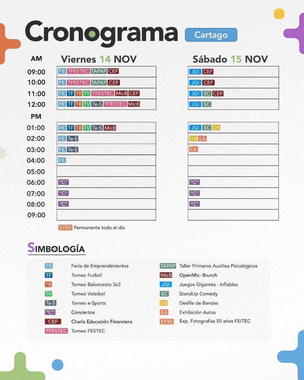 Eventos Especiales | Miércoles, Viernes y Sábado | Conciertos (C°) por las noches, Presentación Expresión Corporal TEC (PrEC), OpenMic-Brunch (MicB) y la Exp. Fotografías 50 años FEITEC (EF50) permanente. |