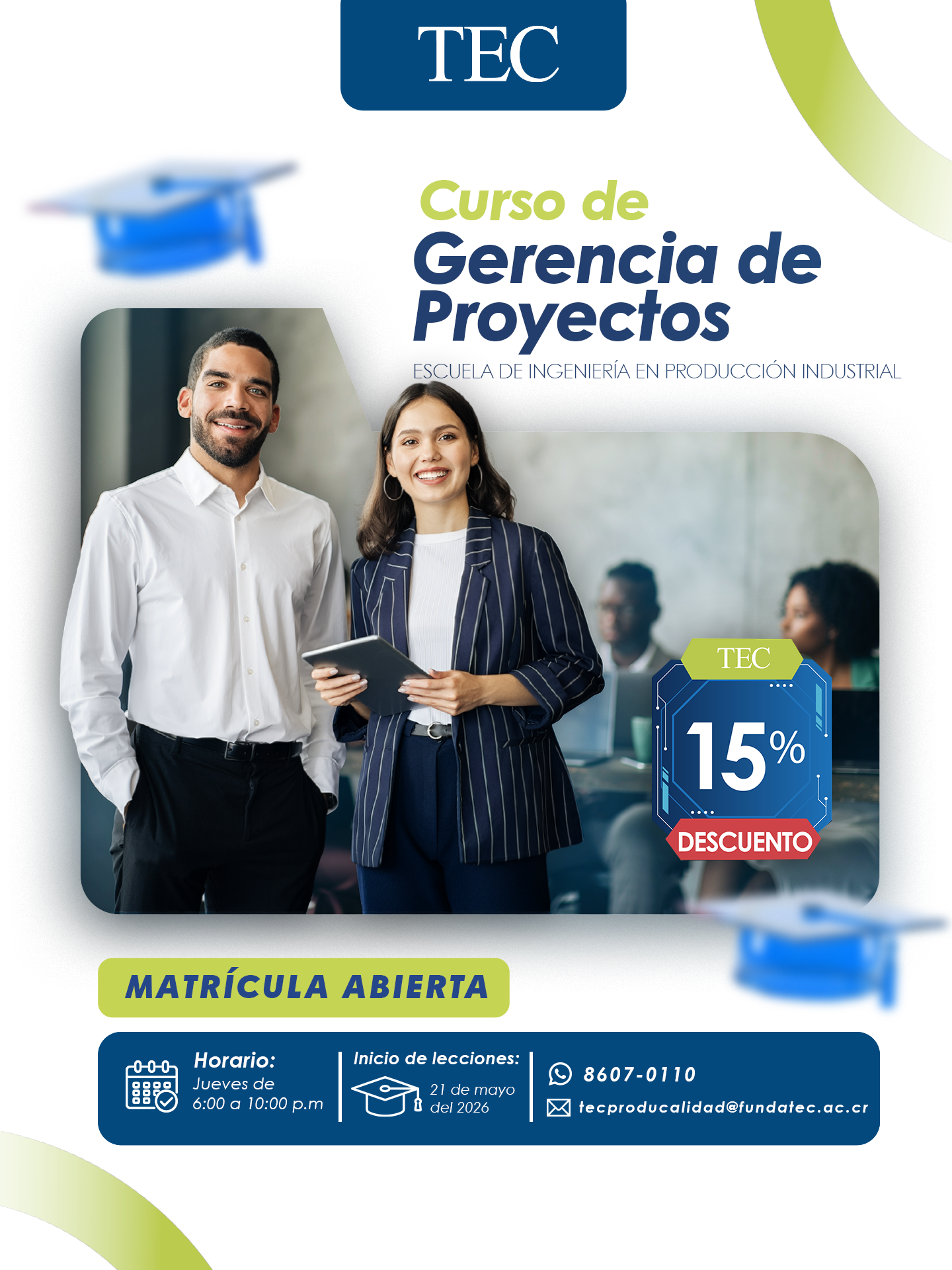 Descuento del 15% aplicable durante la fecha de matrícula disponible