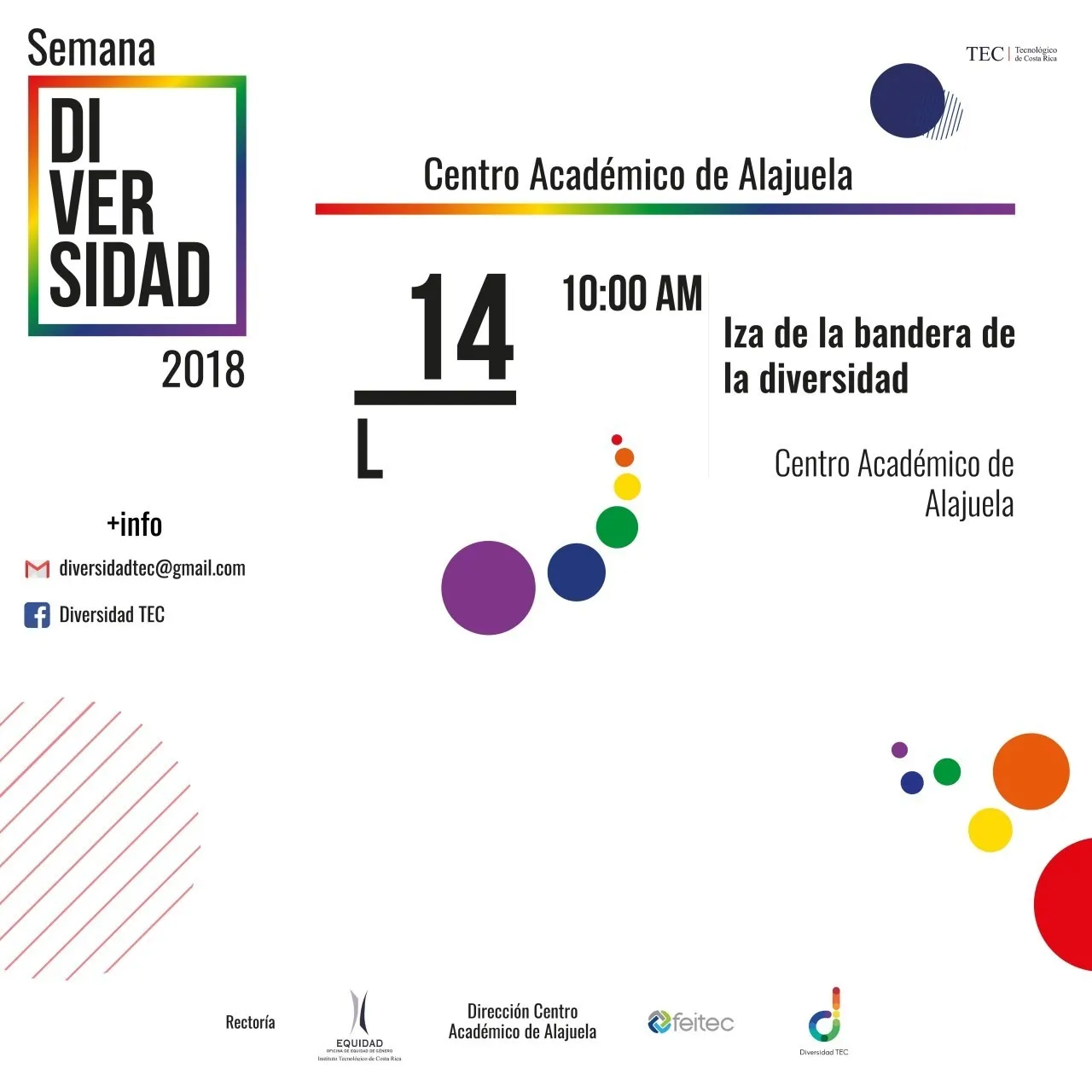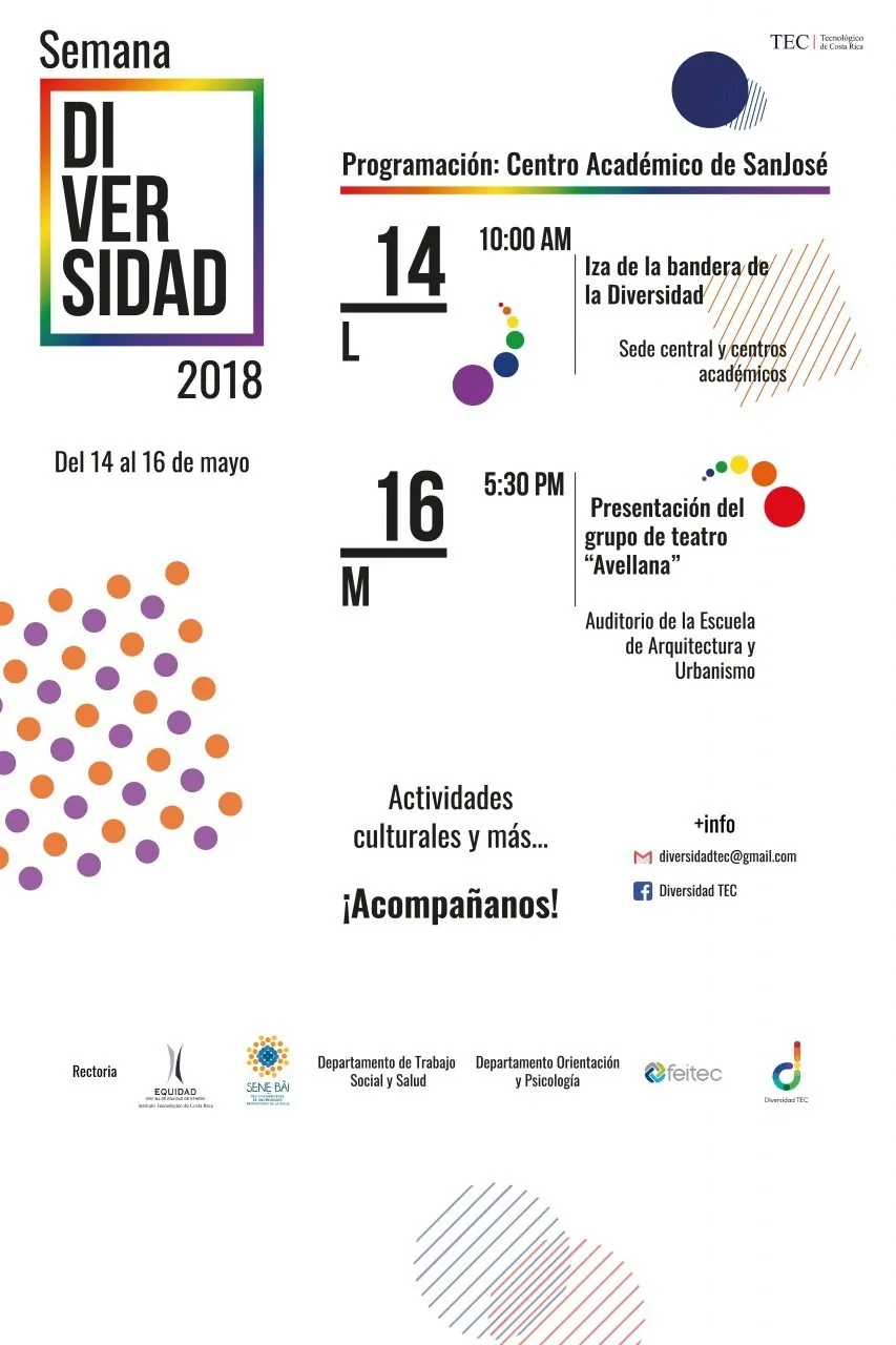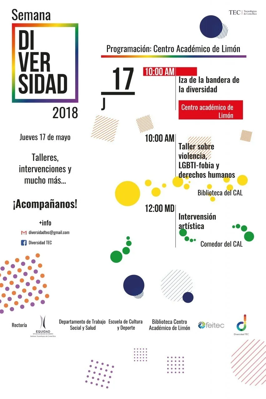 Para el jueves 17, en el pretil de la Sede Central se hará un performance e intervención del espacio público a partir de las 11:30 a.m. Y a partir de las 8 p.m., en el Centro de las Artes será el evento: "Una fiesta de colores", el cual incluirá música, Drag Show y la conmemoración de los 10 años de la Semana de la Diversidad en el TEC.