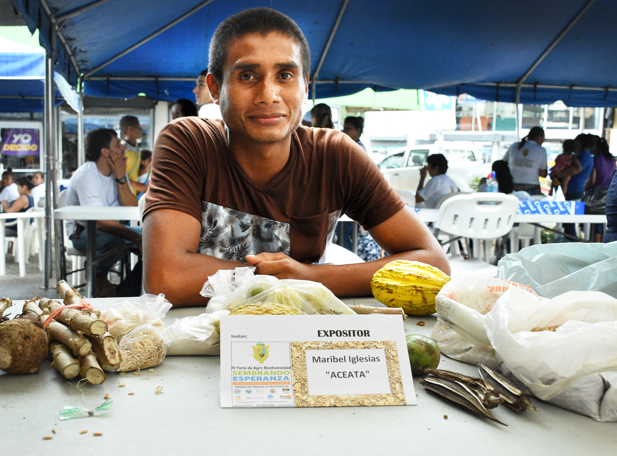 Ballarino Oniel, uno de los beneficiados por los proyectos de extensión del TEC, participó en la Feria de la Semilla y expuso los productos de Aceata (Asociación Comunitaria de Ecoturismo y Agricultura orgánica de Telire). Foto: Ruth Garita/OCM.