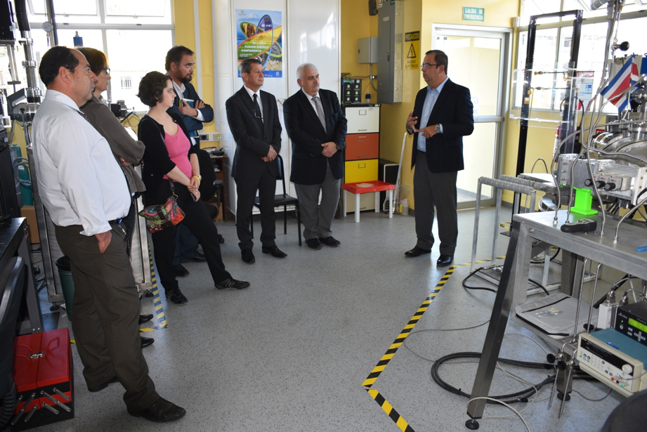 Iván Vargas, doctor en física de plasma y fusión nuclear y coordinador del Laboratorio de Plasmas para energía de fusión y aplicaciones del TEC, explica el funcionamiento Stellarator de Costa Rica 1(SCR-1) a los representantes de HCERES. (Foto OCM).