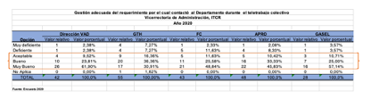 Desde la Vicerrectoría de Administración, en octubre del 2020 se aplicó un instrumento para analizar la percepción de directores y coordinadores del ITCR, respecto al nivel de satisfacción por el uso de los servicios ofrecidos bajo la modalidad de teletrabajo colectivo, esta fue la primera experiencia a la que se enfrentaban sus Departamentos para trabajar bajo la nueva modalidad.
