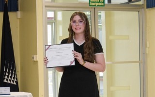 Momento en que el máster Randall Chaves le hace entrega del certificado de acreditación de la licenciatura en Ingeniería en Agronegocios a la joven Laura Tencio, presidenta de la Asociación de Estudiantes de la Escuela de Agronegocios. Fotografía Anthony Fuentes Calvo/TEC.