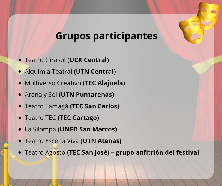 Entre los elencos destacados se encontraron Tamagá del Campus San Carlos, Teatro Agosto del Campus San José, Teatro TEC del Campus Central y Multiverso Creativo del Campus Alajuela. Aunque el grupo del TEC Limón no logró asistir por un cierre en la ruta 32, se presentaron nueve grupos teatrales con propuestas creativas y de alta calidad escénica.
