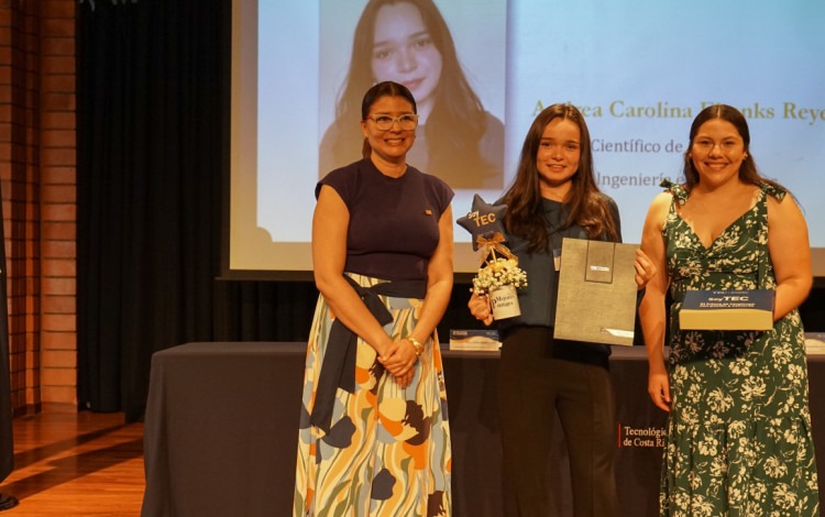 Andrea Ebanks junto a sus padres Giovanni Ebanks y Carolina Reyes, en el acto de reconocimiento de los mejores puntajes de admisión al TEC 2025-2026. Foto: Pablo Quesada/TEC.