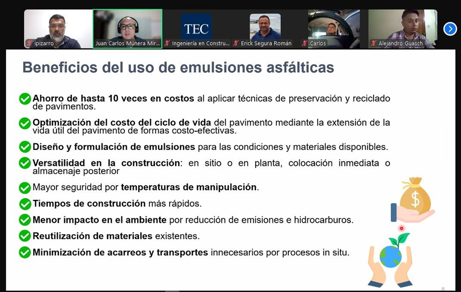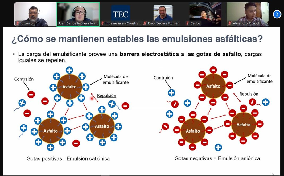 El pasado lunes 6 de octubre se tuvo el agrado de inaugurar el IV trimestre de la Maestría en Ingeniería Vial con el Webinar “Aplicaciones con emulsiones asfálticas en carreteras”, impartido por el Ing. Juan Carlos Múnera, investigador del LANAMMEUCR. Fue una sesión sumamente enriquecedora que permitió profundizar en el uso y comportamiento de las emulsiones asfálticas en distintos contextos de pavimentación, promoviendo la innovación y la sostenibilidad en la infraestructura vial. Agradecemos la activa participación de nuestros estudiantes de maestría, estudiantes de ingeniería y del público en general, quienes con sus aportes y preguntas contribuyeron al éxito de esta actividad académica.