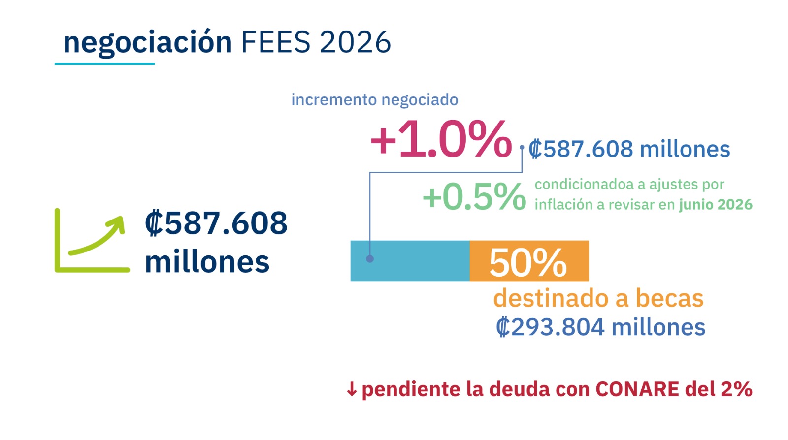 El fortalecimiento del sistema también se vincula con decisiones estratégicas a nivel del país. En la negociación del Fondo Especial para la Educación Superior (FEES) 2026, se acordó destinar el 0,5% del incremento presupuestario exclusivamente a becas y apoyos estudiantiles, además del compromiso de incrementar estos recursos en al menos ₡2.938 millones.