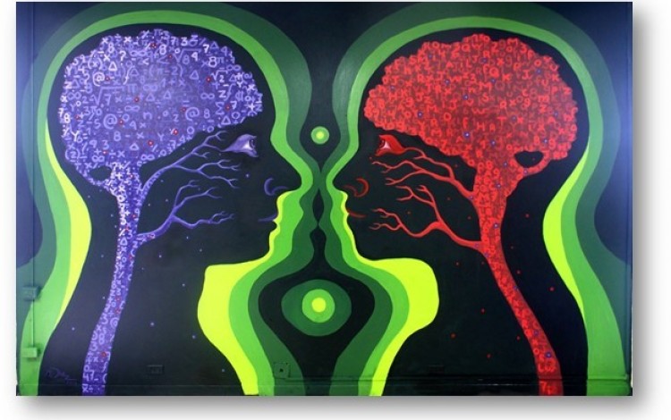 La obra de 4.40 m x 2.90 m utiliza la metáfora de los árboles para representar las masas cerebrales de dos cabezas humanas cuyas neuronas-hojas- son dibujadas como letras, números y símbolos matemáticos para dar como resultado el conjunto de dos figuras que reciben conocimiento-luz- y se transmiten ideas entre sí.