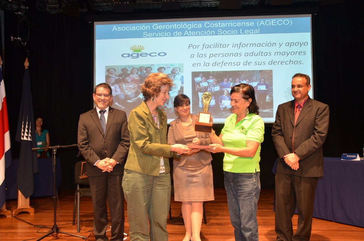 En la categoría organización de la sociedad civil fue galardonada la Asociación Gerontológica Costarricense (AGECO), por facilitar y defender los derechos de las personas adultas mayores.