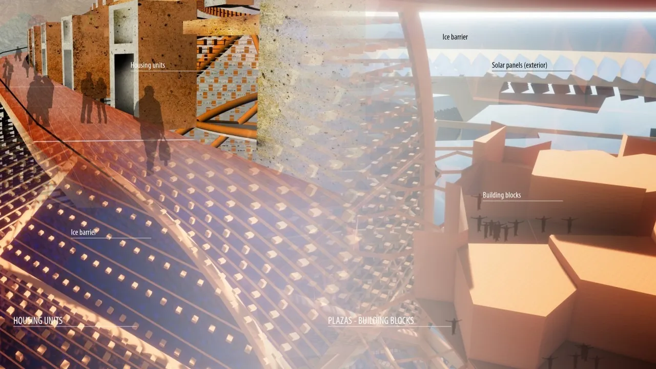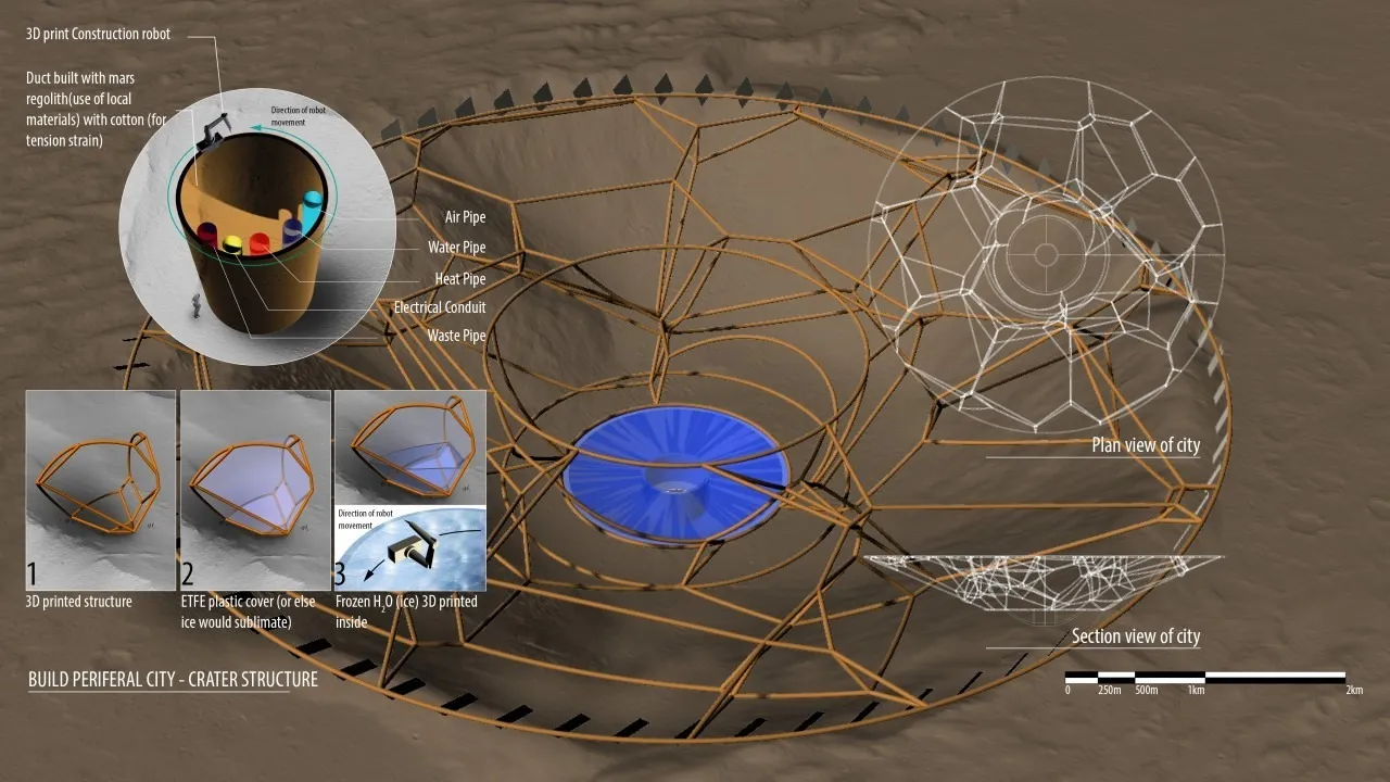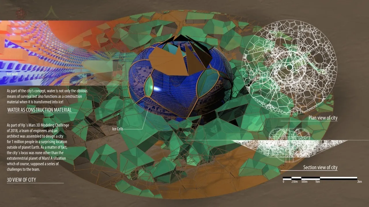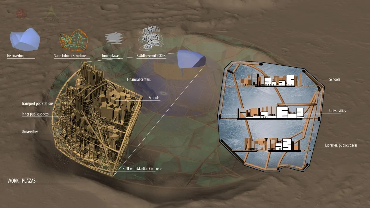 Asimismo, incluye elementos explicativos de cómo se podría construir la ciudad en módulos o celdas, y se incluyen materiales presentes en Marte, incluso el hielo marciano.