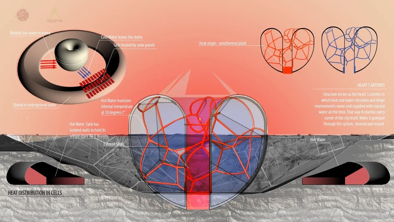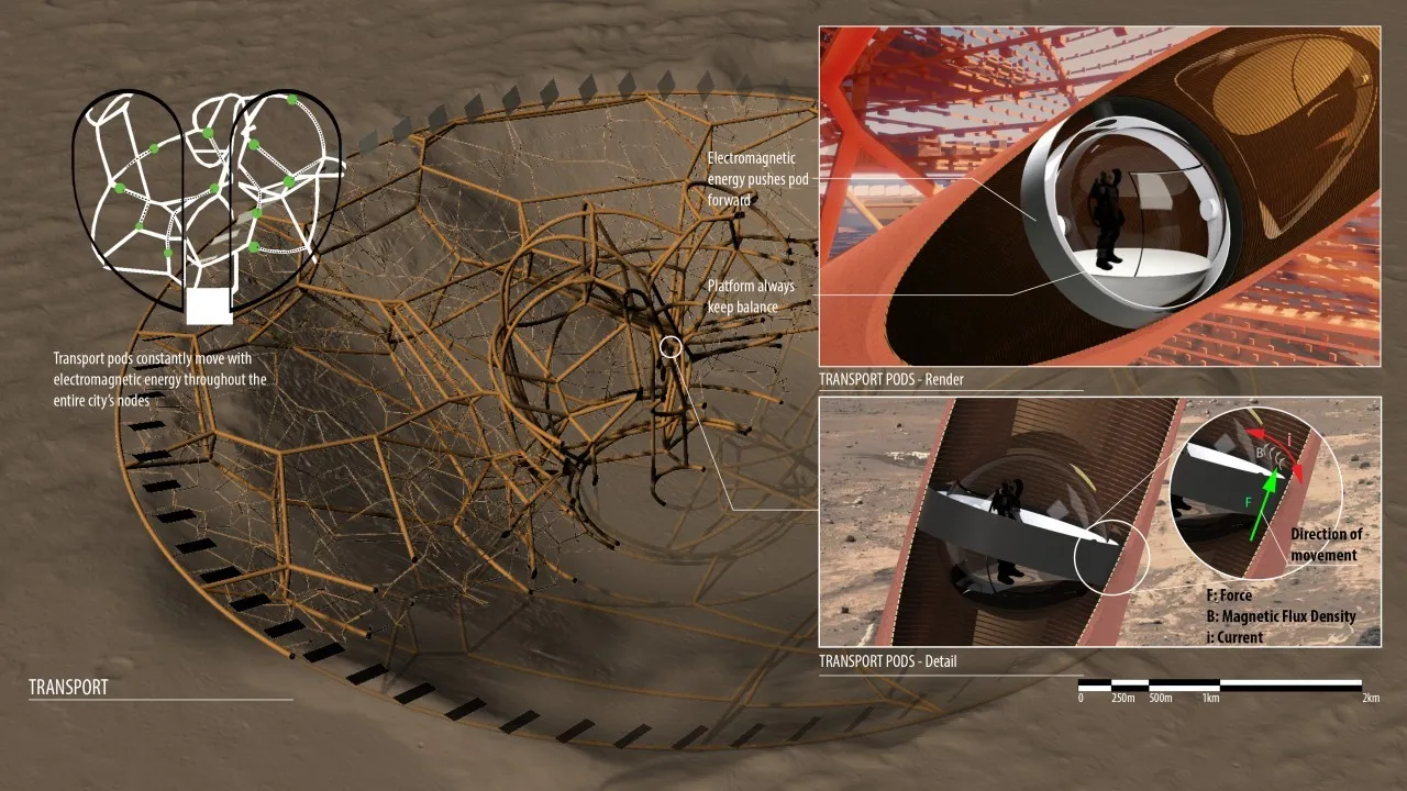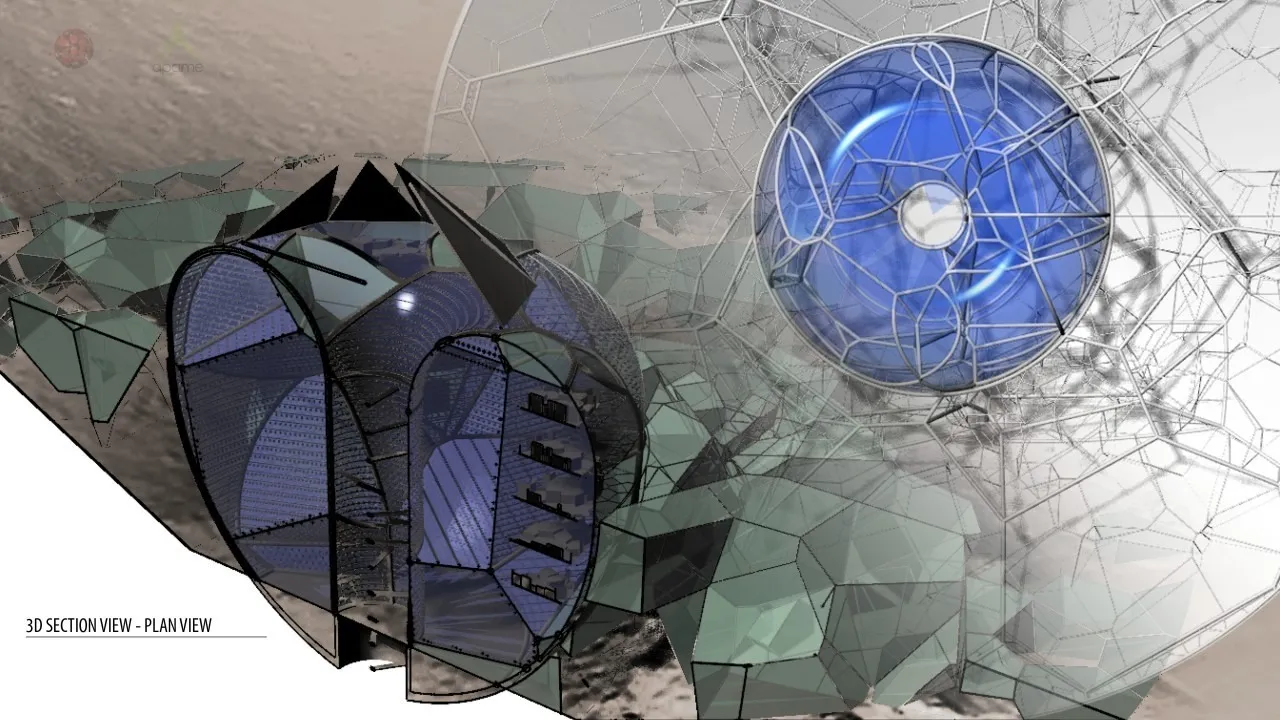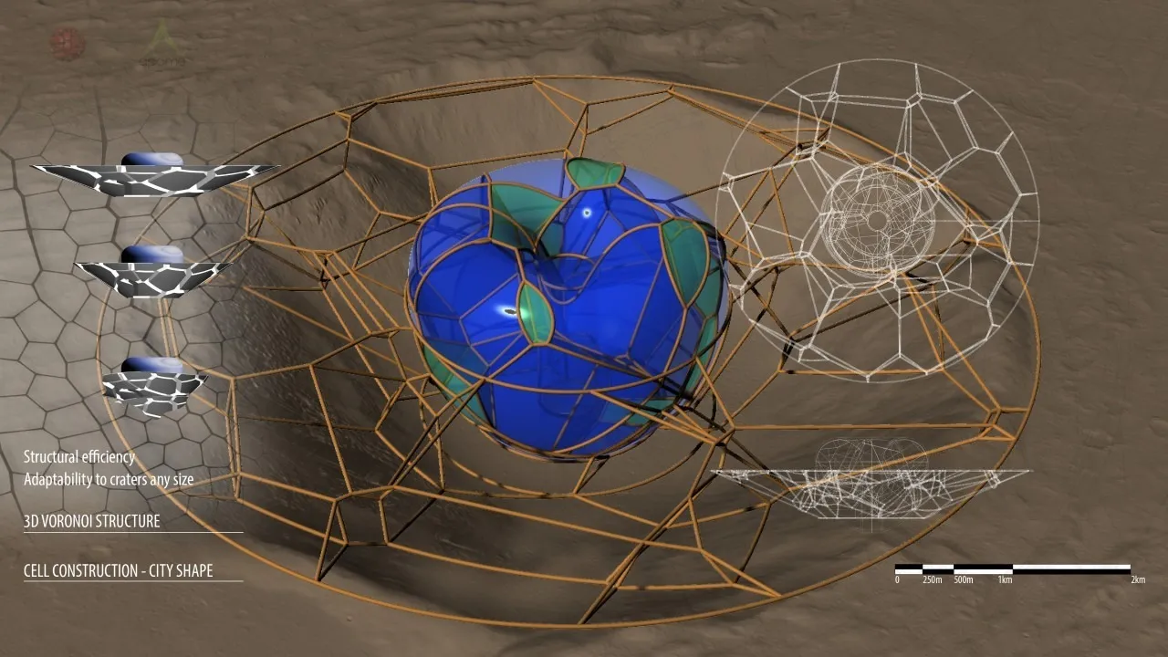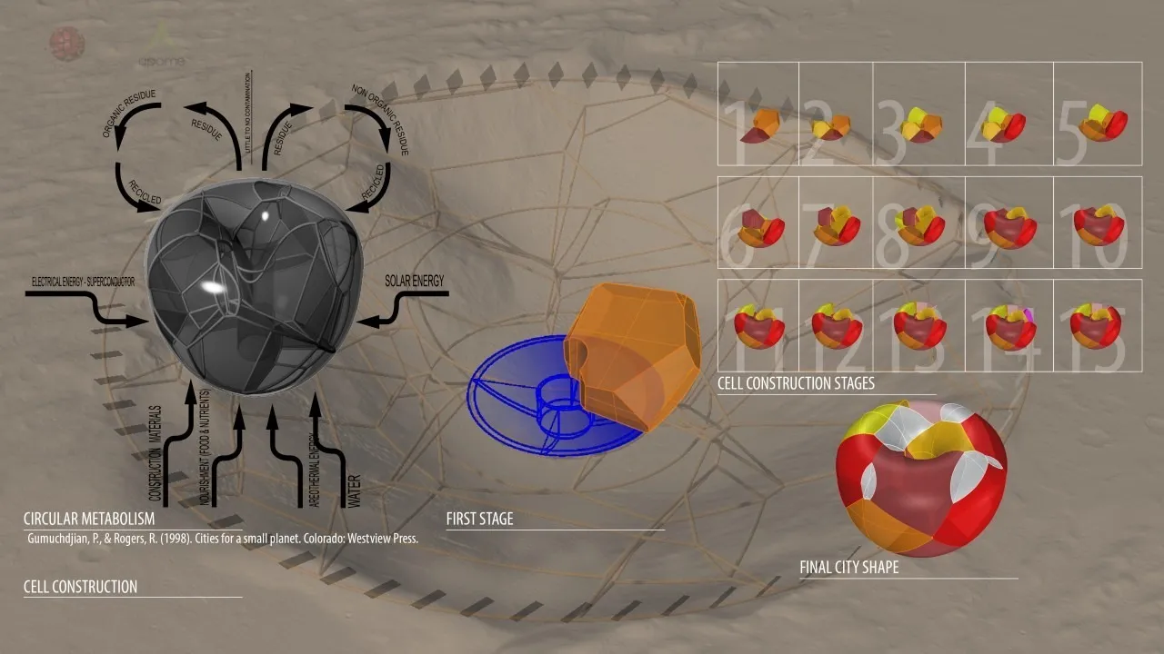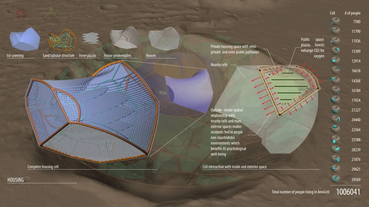 “AreoCell se conceptualiza como la semilla de la civilización en este nuevo, fascinante e inexplorado mundo que es Marte. Se pretende que quienes habiten en esta ciudad disfruten de nuevas alturas, formas de ver el mundo y estímulos psicológicos para sus actividades diarias. Está pensada como una ciudad para respirar, admirar el paisaje marciano circundante y regocijarse con el amplio diseño de espacio interior que ofrece.