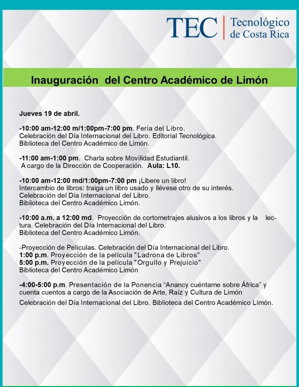 Inauguración: miércoles 18 abril, a las 3 pm Retreta con la Banda de Conciertos de Limón, a las 2 pm