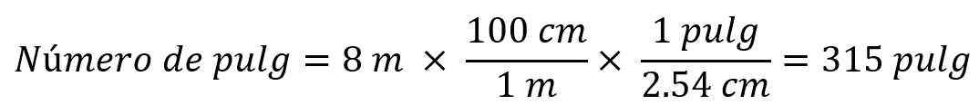 Al aplicar el primer factor de conversión para cancelar metros y convertir la longitud en centímetros. Por ello, se escribe metros en el denominador y centímetros en el numerador. El segundo factor de conversión debe cancelar centímetros, así que tiene centímetros en el denominador y pulgadas, la unidad deseada, en el numerador.