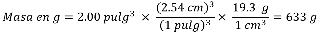 También se tienen factores de conversión que convierten de una medida a otra. Supongamos que nos interesa conocer la masa en gramos de dos pulgadas cúbicas (2,00 pulg3) de oro, que tiene una densidad de 19,3 g/cm3. Dado que la respuesta deseada es una masa en gramos, es evidente que necesitaremos el primero de estos factores, que tiene masa en gramos en el numerador. Sin embargo, para poder usar este factor necesitaremos convertir primero pulgadas cúbicas en centímetros cúbicos. La relación entre pulg3 y cm3 no está dada en tablas, pero sí la relación entre pulgadas y centímetros: 1 pulg = 2,54 cm (exactamente). Si elevamos al cubo ambos miembros de esta ecuación, tendremos (1 pulg)3 = (2.54 cm)3, de donde podemos obtener el factor de conversión deseado para resolver el problema.