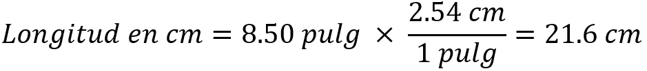 Usamos el primero de estos factores cuando queremos convertir pulgadas en centímetros. Por ejemplo, la longitud en centímetros de un objeto que tiene 8,50 pulg de largo está dada por: