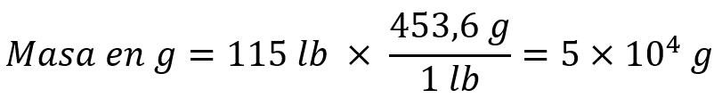 Ejercicio: Si una mujer tiene una masa de 115 lb, ¿Qué masa tiene en gramos?