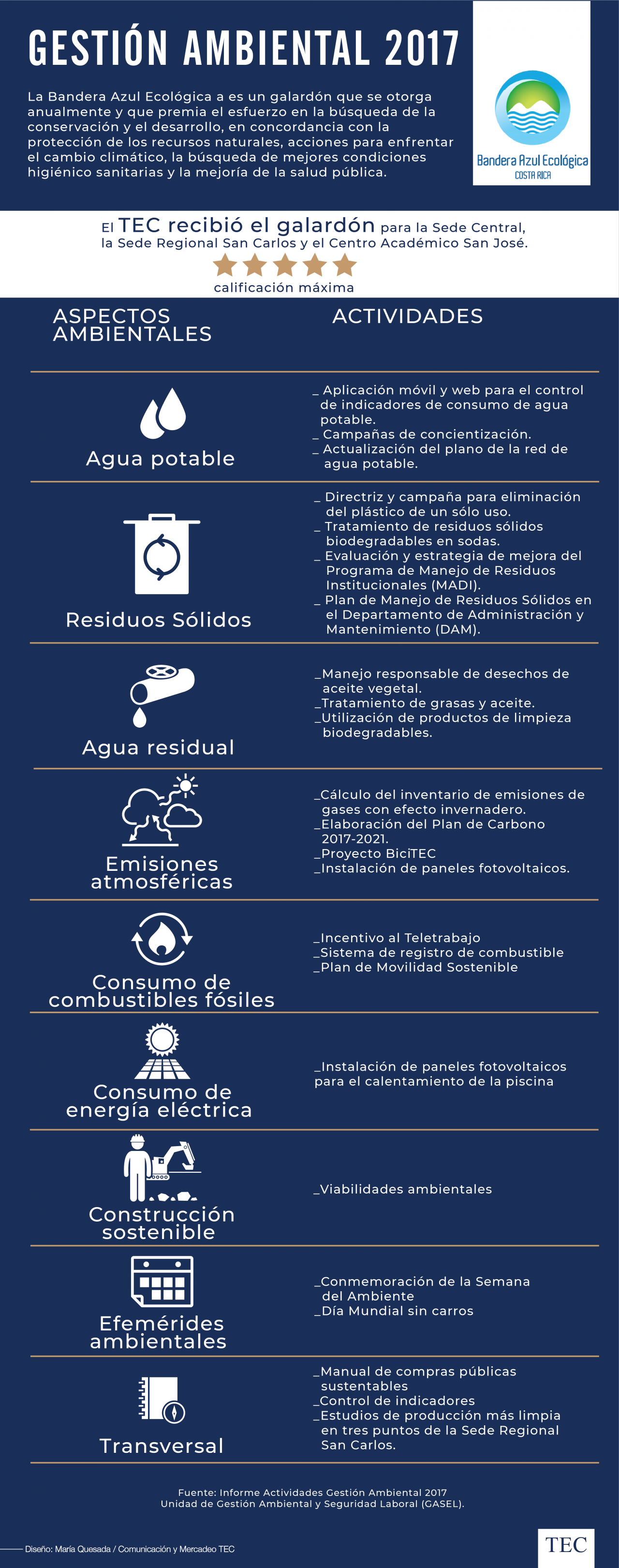Aunque el TEC ha tenido participación en la Bandera Azul y ha obtenido la máxima calificación desde el 2010, es durante el 2017 que se fortalecieron importantes proyectos en distintos aspectos ambientales tales como el control de emisiones atmosféricas, educación ambiental, consumo de combustibles fósiles, residuos sólidos, agua residuales, consumo de energía y construcciones sostenibles.